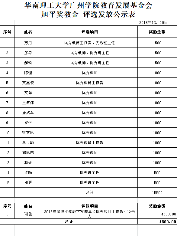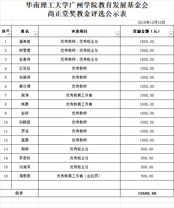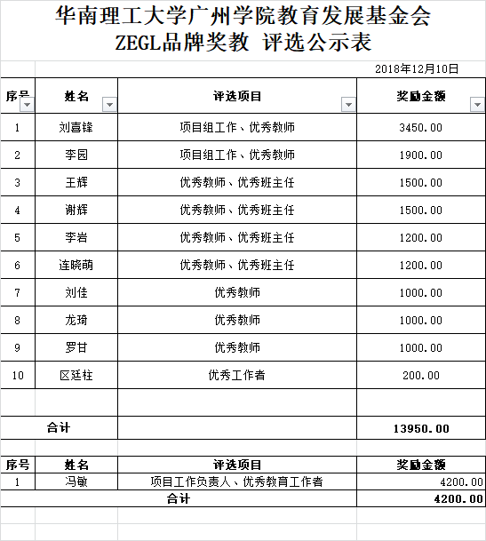 获得2018年度华南理工大学广州学院教育发展基金会旭平奖教金、尚正堂奖教金、ZEGL品牌奖教金等优秀教师初审名单的通知