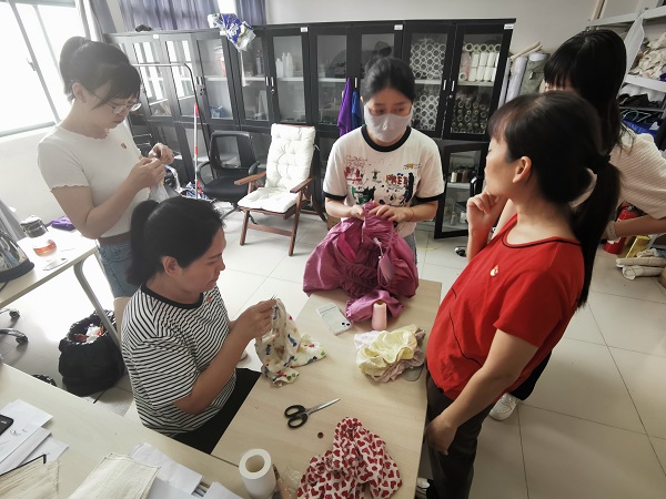 活动期间,支部党员一早就全部到位,有序分工协作,对群众拿过来的服装,首先从面料、结构、工艺等方面展开细致研究,然后分拆线头、缝衣服、烫面料、打孔位、后整理等多个工序认真整改,四个小时共完成20余件服装和包袋的整改工作,获得群众一致好评。