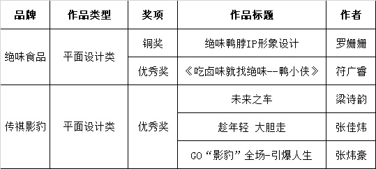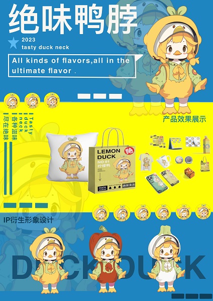 获得铜奖的作品是专门为绝位鸭脖设计的一款IP形象设计:绝味鸭鸭公主,作品共有三款衍生设计,分别是柠檬鸭、香辣鸭、蒜香鸭,作者分别从形象表情包、海报设计、产品效果图展示这几个方面进行设计。作者通过对IP的设计,建立产品符号,提高品牌辨识度,帮助品牌建立具有亲和力形象的IP,建立品牌记忆点,从而提高营业额。具有可爱特色的IP形象设计,摆放在店门口,也可以极大提升门店的发现率,将绝味鸭脖的品牌理念通过IP形象更好的展示出来。作品作者来自2021级视觉传达专业的罗珊珊说道:“这次比赛的经历非常难忘。看到了来自粤港澳大广节的众多优秀选手竞技,让我感受到了巨大的压力,但也收获了宝贵的经验,学习到了很多知识。参加这个比赛是一次非常有意义的经历,可以锻炼自己的技能水平、拓宽视野等。同时,我也意识到在今后的设计中需要注意细节、注重团队合作、不断反思和总结经验教训,不断提高自己的能力和水平。”获得优秀奖的2022级视觉传达设计专业的张佳炜在赛后说道:“整个典礼让我心潮澎湃,紧张而刺激。现场的提案和评委们的公平公正打分,给我留下了深刻的印象。评委们诚挚的评价对我而言非常宝贵,例如,在设计时要注重保持品牌的调性,并在设计落地时兼顾实用性与创新性,确定使用场景。此外,在现场提案时的反应也会直接影响最终评分,从容地解释和展示将使评委们对作品评价更高。良好的讲解方式同样至关重要,先讲述构思,再深入说明作品中的故事情节等内容。这次的活动深深地启迪了我,为我打开了新的视野。我希望未来能有更多机会参与类似的活动,在其中继续成长和提升自己的广告创意能力。”