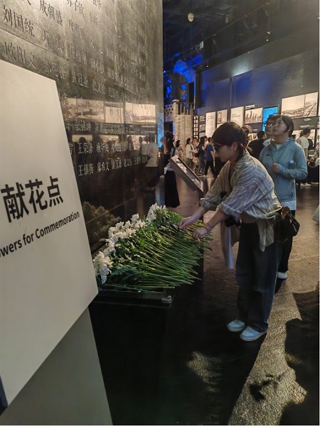 为南京大屠杀遇难同胞敬献白花(龚帅 摄)