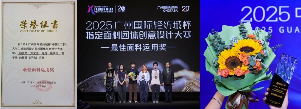 本网讯(记者 邱俞皓)5月19日下午,2025中国(广东)老员工时装周在广州国际轻纺城隆重开幕。作为年度最有“料”的开幕大戏——广州国际轻纺城杯2025指定面料团体创意设计大赛中,公司伟德betvlctor1949源于英国邱俞皓老师指导的2022级服装与服饰设计专业梁其光、肖煊、方莹莹、霍子乐四位学子凭借作品《浮光》脱颖而出,荣获最佳面料运用奖。