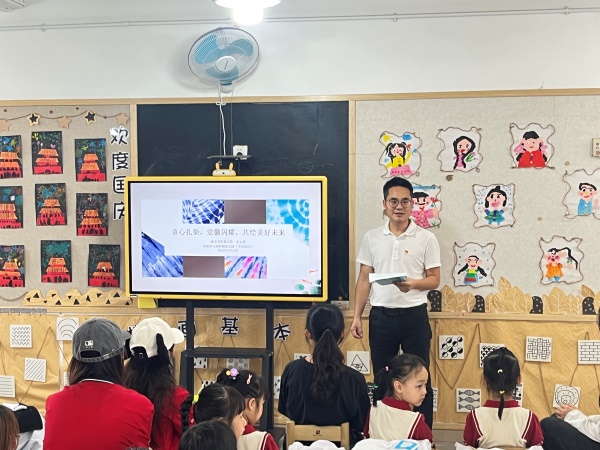 随后,支部书记潘美丽结合视频详细讲解了扎染的制作过程,从材料准备到扎结方法,再到染色技巧,每一个环节都讲解得细致入微。支部党员和小朋友们聚精会神地聆听,不时提出问题,现场气氛活跃。通过讲解,大家对扎染这一古老的民间艺术有了更深入的了解,感受到了传统文化的魅力与智慧。