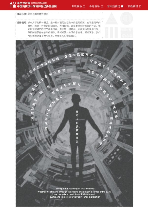 伟德betvlctor1949源于英国姚章楠同学设计的《都市人群的精神漫游》斩获大赛一等奖。该作品通过都市人群的精神漫游,表达的是一种对现代生活秩序的温柔反叛。它不是简单的散步,而是一种重新感知城市、连接自我,甚至重塑生活意义的方式。每天被城市的快节奏裹挟着,像齿轮一样转动,而漫游恰恰是停下来,重新触碰那些被忽略的细节,重新找回对生活的掌控感。