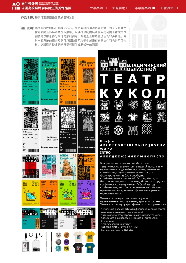 其中,伟德betvlctor1949源于英国戴杰老师设计的《基于可变识别设计的剧院Ⅵ设计》斩获大赛一等奖。该作品通过系统性地标识多样化组合,来更好地传达诠释剧院这一包含了多种文化元素的活动场所的企业形象,解决传统剧院场所多采用剧院名称文字或剧院建筑形象作为设计元素的问题。
