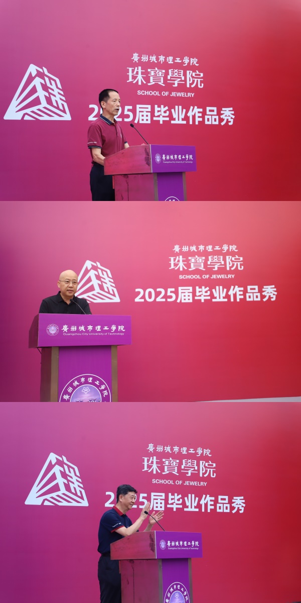 副董事长尚启超在致辞中向毕业生表示热烈祝贺,向教师致以崇高敬意,向支持学校发展的各界朋友表示感谢。他高度评价了凝聚学子心血与智慧的毕业作品,认为它们完美融合了专业知识、创新能力和家国情怀。广东省珠宝玉石首饰行业协会会长何炬登代表行业致辞,赞赏学院人才培养成果和毕业作品的创新活力,强调了产教融合的重要性,并对毕业生未来寄予厚望。随后,在热烈的掌声中,公司党委书记杜小明宣布毕业设计作品展开幕。