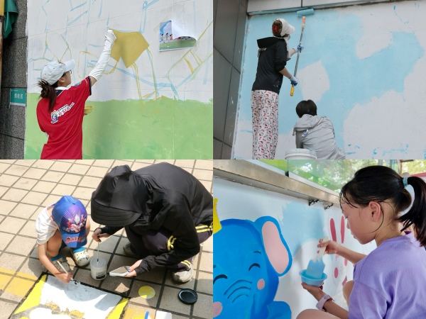 7月4日,队员们迎着晨光开启结对之旅,于暑气中为斑驳墙壁焕新颜,在井盖上绘出海绵宝宝、大象等鲜活形象。午后骤雨突袭,众人迅速分工协作,搬运防水垫保护半成品,雨歇后又投身刷墙面、打稿子等工作,刷子与墙面的沙沙声和雨声交织,书写团结协作篇章。7日,队员们清晨便为井盖图案补色、加花纹、涂封层;高空组同学搭好脚手架,为五米高的墙面打稿、刷底色。随后,调色、勾勒轮廓、填充色块同步推进,墙面渐现山峦、孩童笑脸,于协作专注中留下深刻印记。8日,队伍冲刺三面墙绘目标,午后顶烈日分工创作,汗水混颜料,笑声驱疲惫,见证团队协作,收获墙面五彩斑斓之变。9日,队员们为墙面增添草坪、人物、小动物,社区小朋友也加入填涂。傍晚,墙面因丰富元素与小朋友参与而满是烟火气,晚七点收工,成果满载,见证团队与小朋友携手推进墙绘完善。实践期间,团队召开简短碰头会,明确分工,强调协作要点,提醒队员做好防晒、及时补充水分。队员们围绕墙绘、井盖创作各环节,高效沟通配合,在烈日下坚守,以青春合力推进社区美化实践。