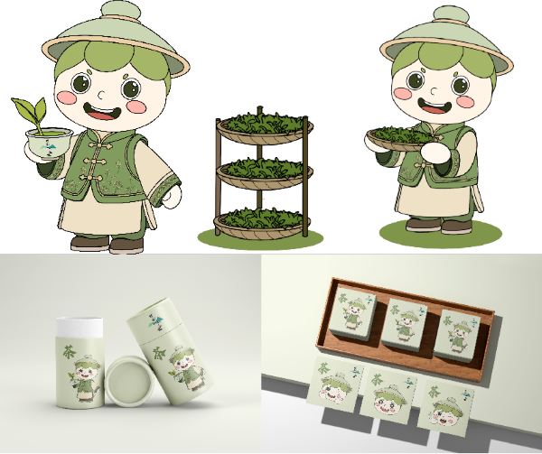 基于对梯面茶文化的深入理解,实践团充分发挥专业优势,以茶文化为核心进行设计。在IP形象设计上,团队精心打造了“梯小茶”形象:主体采用清新的绿色调,象征茶叶的天然本色;搭配质朴的米色调,传递出客家文化的亲和力。人物身着改良中式服装,绿色马褂与袖口的荷花纹样巧妙融合了梯面镇的地域特色。特别设计的茶杯盖帽饰与手中萌发新芽的茶杯,既突出了茶产业主题,又通过茶杯上的梯面镇标识强化了品牌识别度。实践团进一步将IP形象延伸应用至茶叶包装设计,开发了一系列兼具文化内涵与市场吸引力的产品包装。