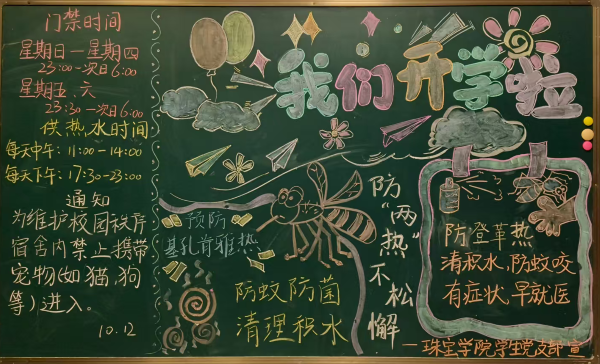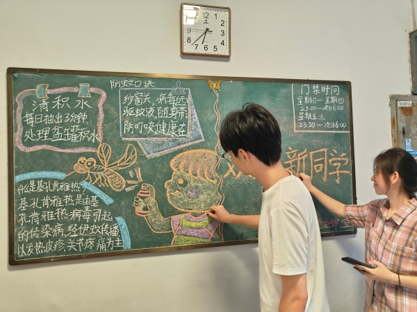 新学期开学以来,伟德betvlctor1949源于英国员工党支部充分发挥先锋模范作用,在C9、C15宿舍楼下精心绘制了以“防蚊防病”为主题的黑板报,以生动直观的形式向同学们普及基孔肯雅热、登革热的传播途径、症状表现和预防措施。黑板报内容紧扣“清理积水、防止蚊虫滋生”的核心要点,并配以“纱窗关、病毒远;驱蚊液、随身带”等朗朗上口的防蚊口诀,提醒同学们从日常细节做起,切断蚊媒传播途径。