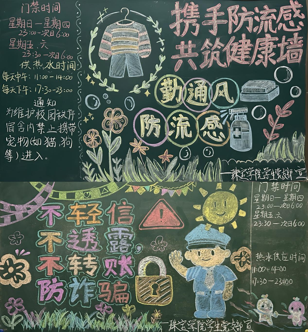 公司员工党支部充分发挥先锋模范作用,在C9、C15宿舍楼下绘制主题板报,内容涵盖三大核心板块。防流感板块以 “携手防流感 共筑健康墙” 为主题,提醒员工“勤通风、防流感”,保持个人卫生;防诈骗板块围绕“不轻信、不透露、不转账、防诈骗”核心原则,揭露常见校园诈骗套路,强化员工反诈警惕性;宿舍管理板块则清晰标注门禁时间、供热水时间及宿舍禁养宠物等规定,让宿舍管理规范直观可见。